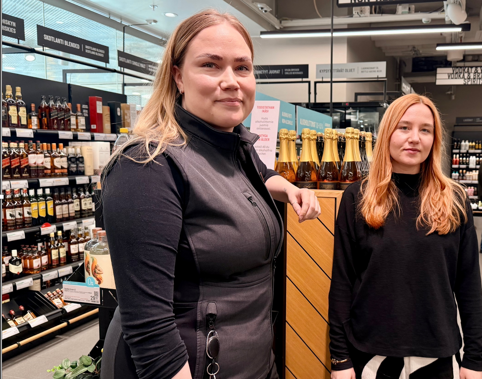 Jenni Jalonen (vas) ja Lila Helenius palvelevat vastaavat mielellään juomiin liittyviin kysymyksiin Eastonin Alkossa.