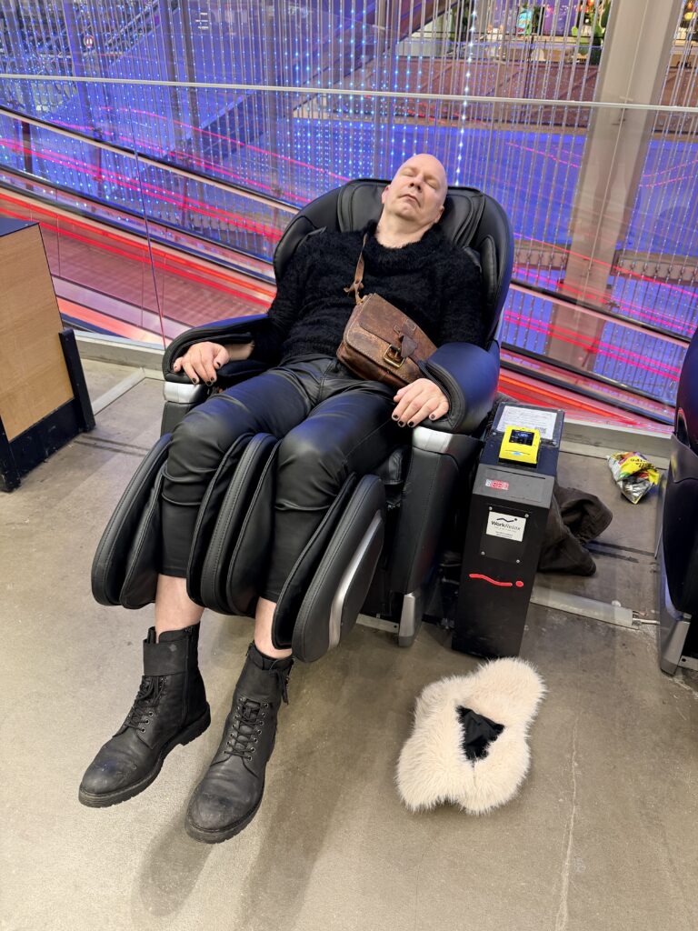 Kellon lyödessä puolta yötä kuuntelemme kauppakeskuksen äänimaisemaa kassoja vastapäätä asetetuista hierontatuoleista – miten ihanaa makoilu niissä onkaan! Muutamalla eurolla saa kymmenen minuutin hieronnan, jonka aikana kyytiä saavat jumit niin niskassa kuin selässäkin. Lisäksi laite puristelee napakasti reisiä ja pohkeita.