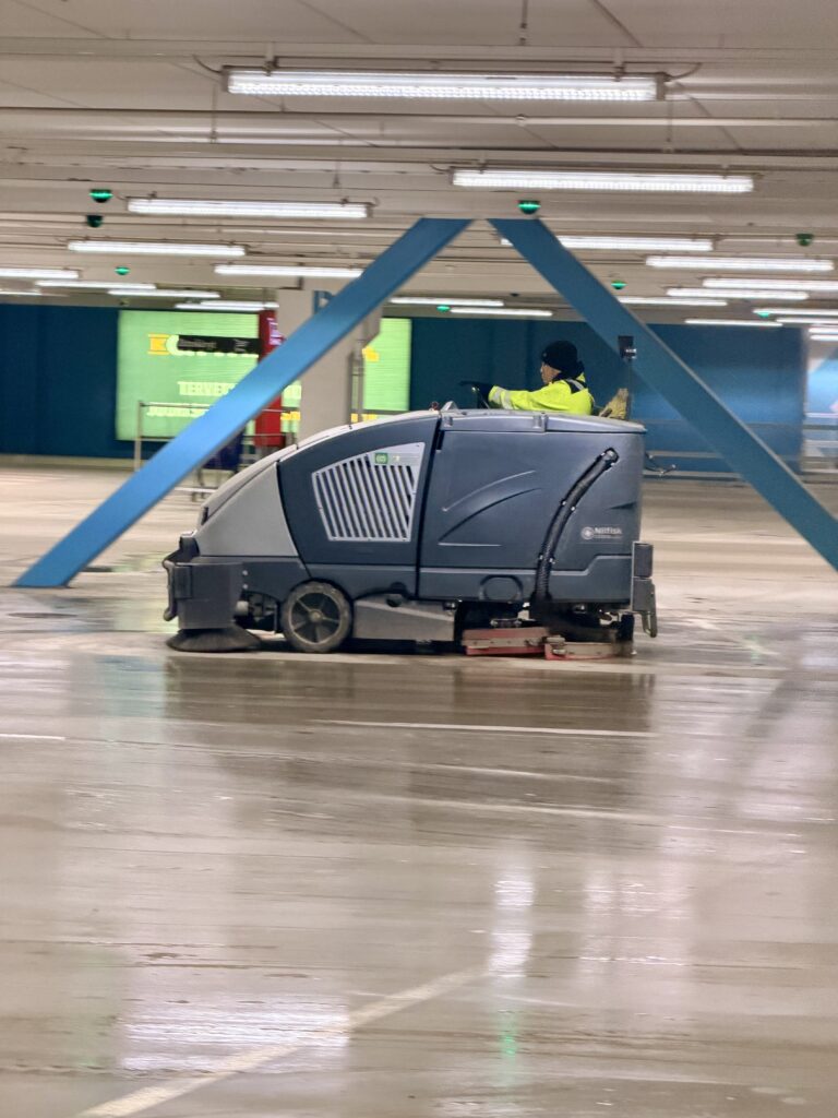 Puoli kolmen ja kuuden välillä kauppakeskuksessa on kaikkein hiljaisinta. Öisin pääsisi kyllä pesemään pyykkiä, mutta nyt siellä ei näy ketään. Myös parkkihalli on tyhjentynyt. Lakaisukoneet putsaavat lattiaa kurasta ja lumesta valmistaen kauppakeskusta uuteen päivään ja uusiin kohtaamisiin.