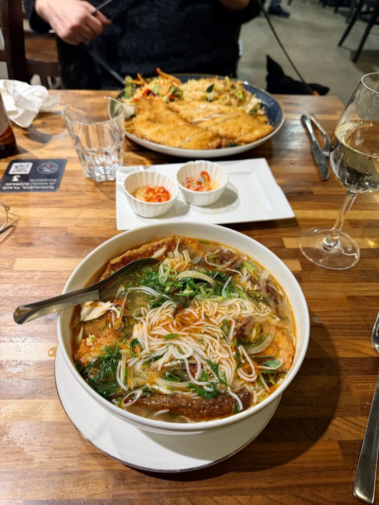 Emme itsekään jää autoon pidemmäksi tovin, vaan suuntaamme Mustin ja Mirrin (herkkuja koiralle!) kautta alakerran Pho Khang Vietiin illalliselle. Ravintolasta saa hyviä riisi- ja nuudeliannoksia ja mainiota pho keittoa, mutta sen listalta löytyy myös erikoisuuksia, joita kannattaa kokeilla. Tällä kertaa testasin Bún Cá Cay -kalanuudelikeiton, joka kuuluu Haiphongin alueen erikoisuuksiin.