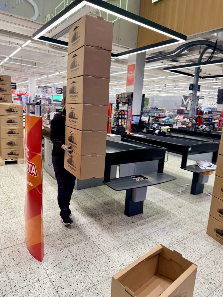 Koska asiakkaat ovat harvassa, yksi kassa riittää hyvin. Siinäkin myyjä ehtii hyvin kasata laatikoita ja jutella vartijoiden kanssa asiakkaita odotellessaan. Pääasiassa yöllä keräillään verkkotilauksia, täytellään hyllyjä ja puretaan kuormaa, siivotaan ja järjestellään. Tehdään kaikkea sellaista, mitä ei päivällä ehdi.