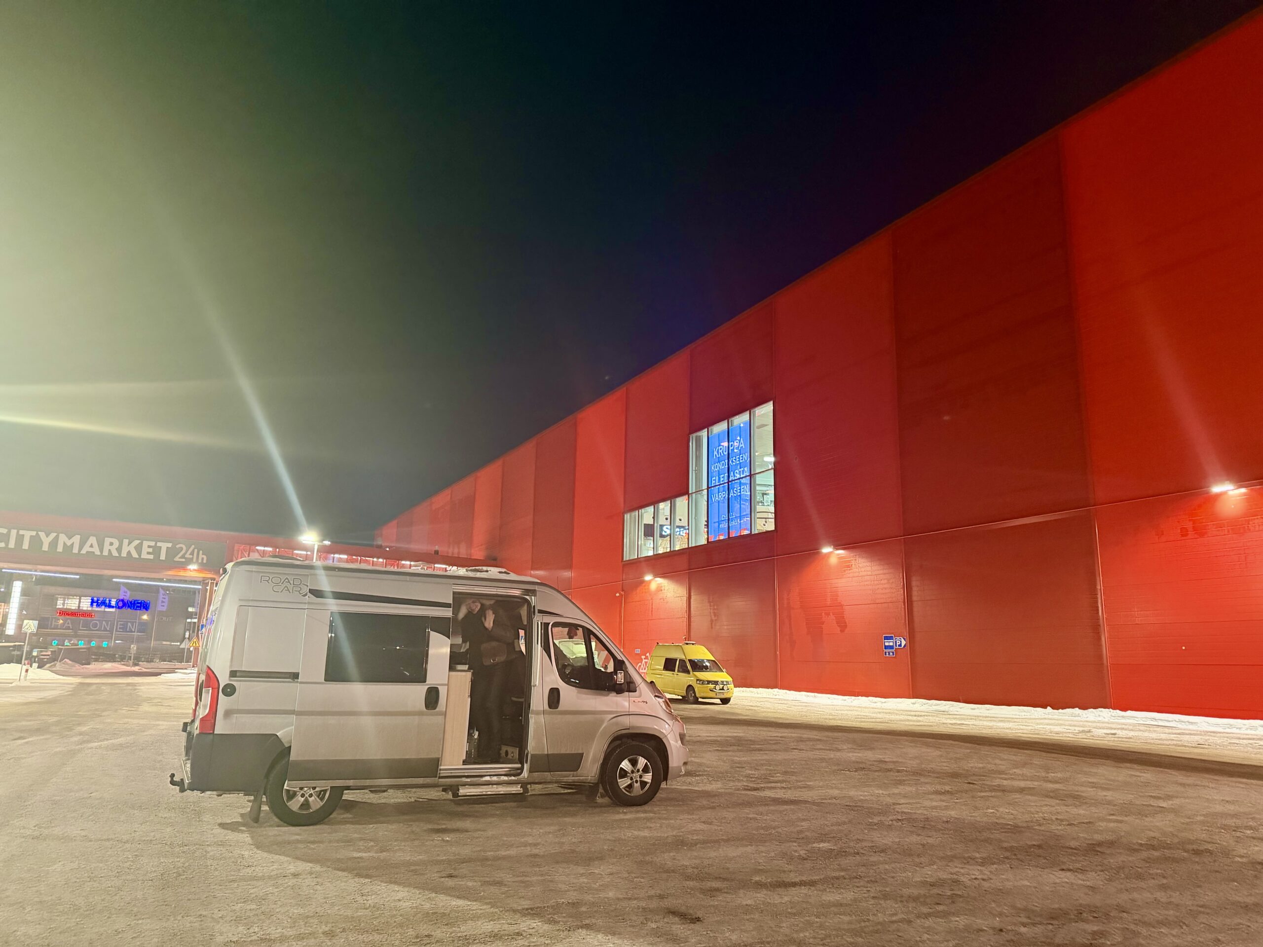 Koska automme ei mahdu parkkihalliin, pysäköimme sen keskelle ulkoparkkista. Kahdeksan aikaan illalla tilaa on hyvin. Ei ole ihme, että pakkasella lämmitetty parkkihalli houkuttelee enemmän.