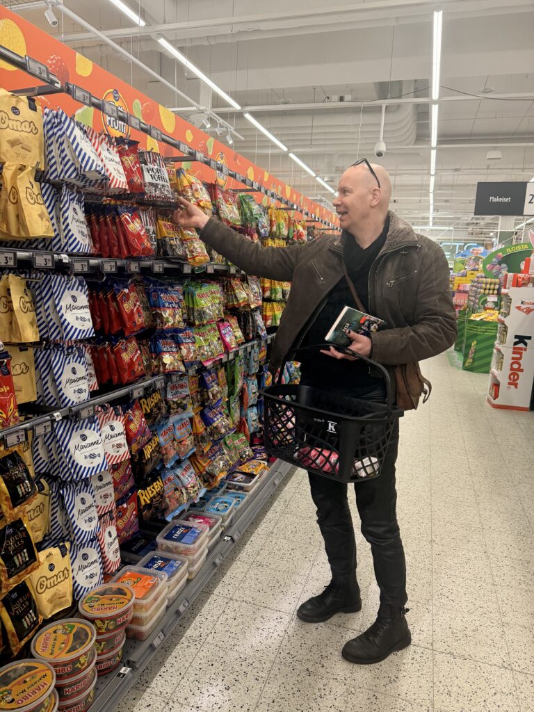 Yöllä kaupassa tehdään nopeita impulssiostoksia. Ne mahtuvat kärryjen sijaan ostoskoriin tai vaikka käteen. Nuoret miehet poikkeavat hakemaan pari juomaa. Mieskaksikko tuli hakemaan maitoa loppuneen tilalle.