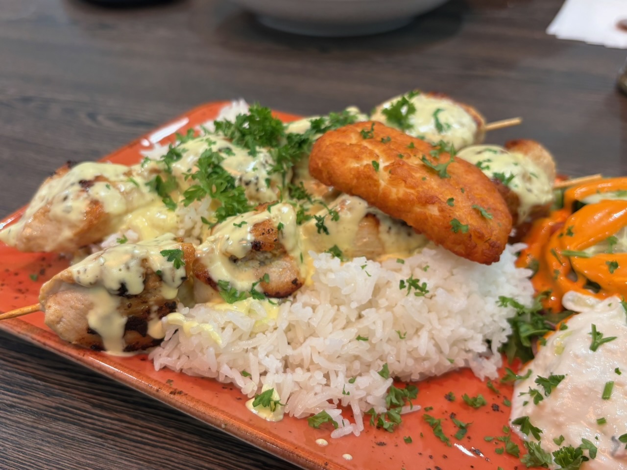 Uuden listan annoksia: kanavartaat fetakastikkeella riisin kera.