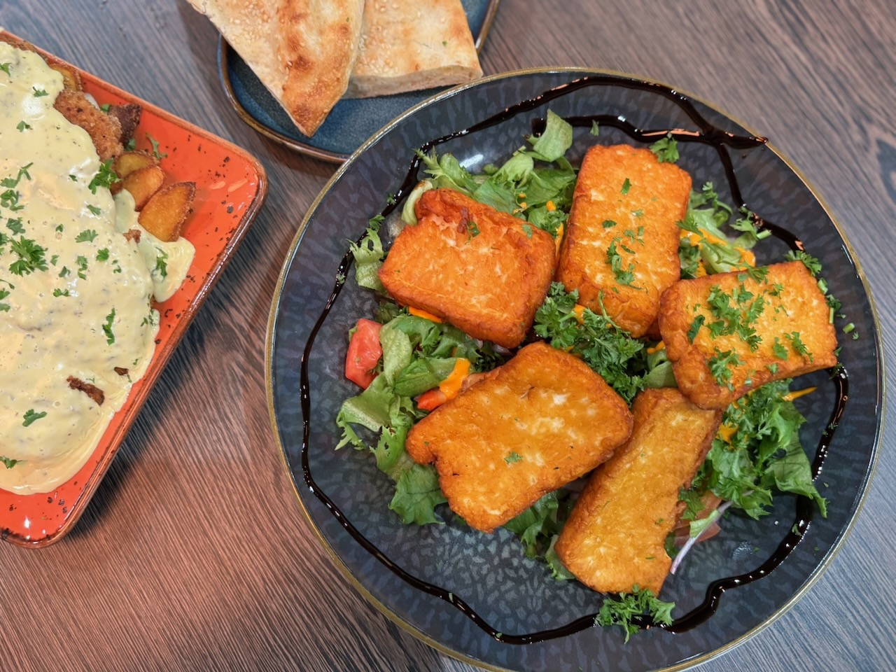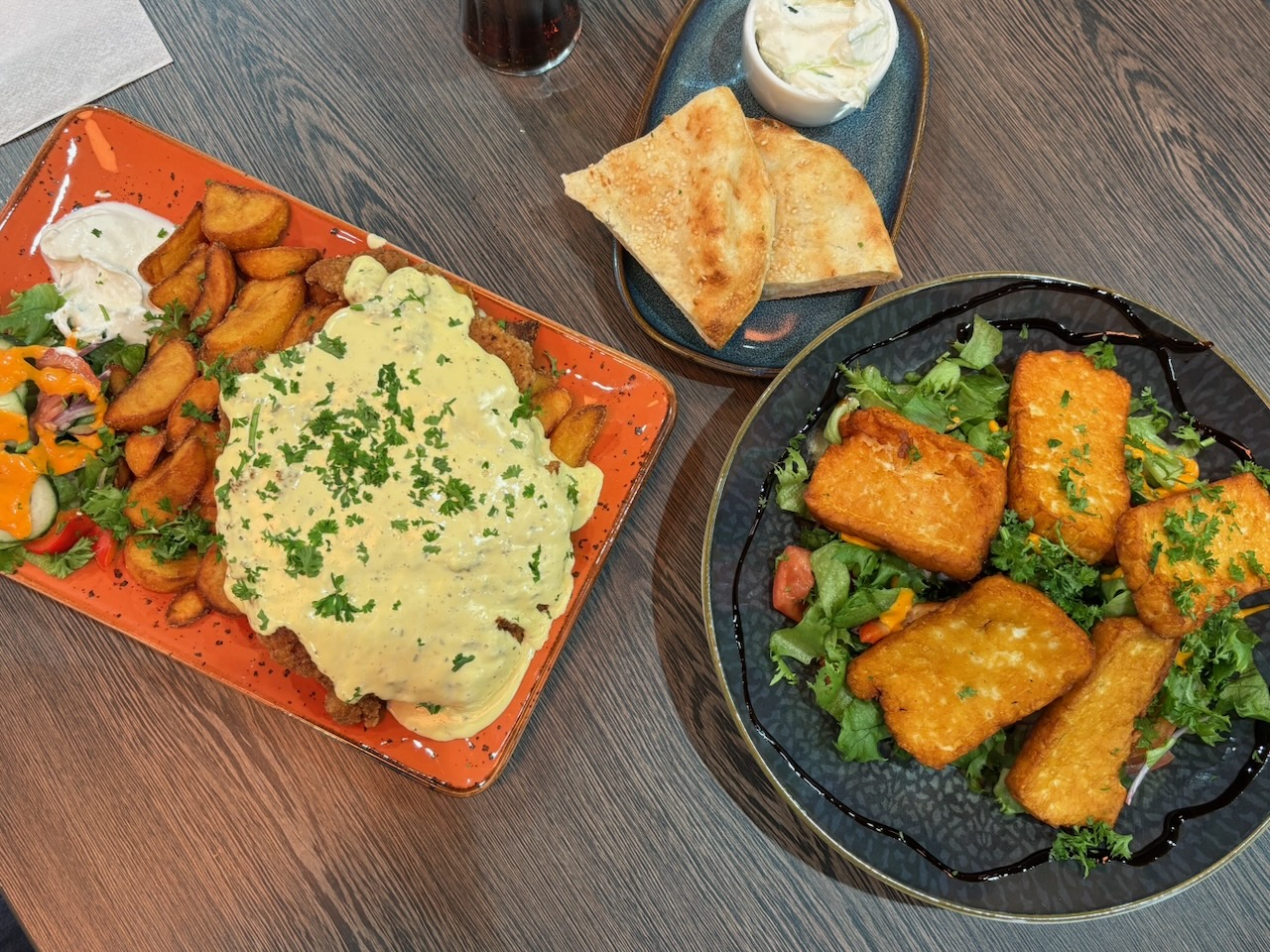Oikealla halloumisalaatti johon kuuluu lämmin leipä ja tsatsikikastike.