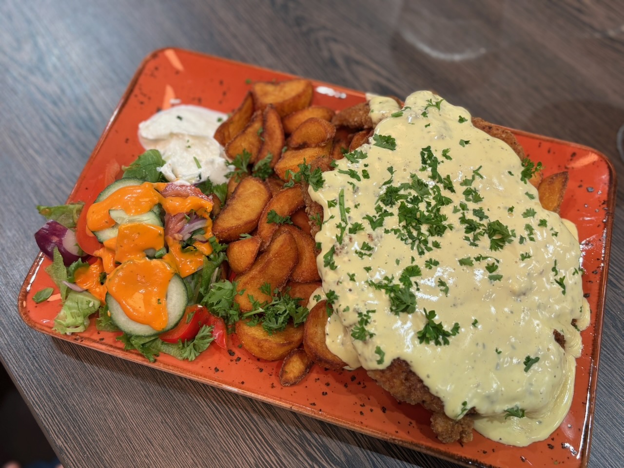 Mahtipossu bearnaisekastikkeella ja lohkoperunoilla.