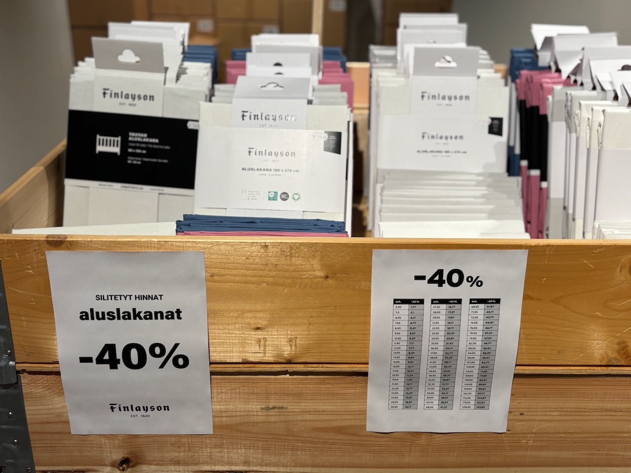 Myymälässä vietetään avajaisia upeiden tarjousten kera. Kaikki normaalihintaiset tuotteet ovat -30 % alennuksessa 23.11. saakka (poislukien Original Long Drink -mallisto). Lisäksi kaikki aluslakanat ovat -40 % alennuksessa 20.11. saakka.