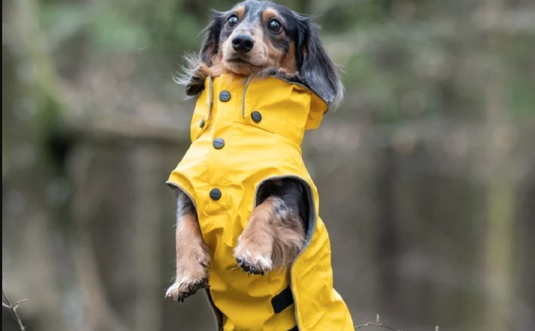 Sadetakkien vedenpitävyys vaihtelee jonkin verran. Varma valinta löytyy Rukkan valikoimasta: keltainen takki kestää kovempaakin sadetta ja sen korkea huppu suojaa myös koiran kasvoja.