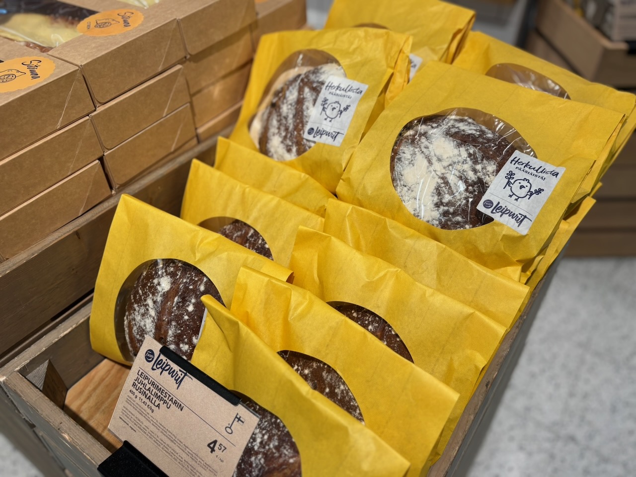 Ruokapuolelta löydät runsaasti pääsiäisen makuja: tuoreet yrtit, hedelmät ja parsat sekä laaja valikoima kakkuja. Tarjolla on esimerkiksi pashakakkuja, juustokakkuja, hedelmämoussekakkuja sekä klassisia suklaa- ja porkkanakakkuja. Fazer Leipurit valmistavat päivittäin sesongin leipurimestarin juhlalimppua, jota saa rusinalla tai ilman. Maukas pääsiäisleipä on pakattu pirteään keltaiseen pussiin, joten sen erottaa helposti muista. Kokeilin itse rusinallista versiota ja rusinat tuovat muutenkin maukkaaseen limppuun ihanan makean vivahteen. Tätä kannattaa ehdottomasti napata mukaan ostoskoriin pääsiäispyhiksi, sillä kyseessä on sesonkileipä.