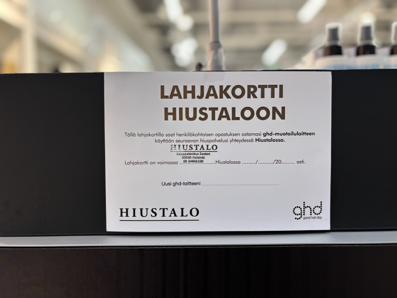 Tällä hetkellä Eastonin Hiustalossa on käynnissä kampanja, joka tekee laitteen hankinnasta entistä houkuttelevampaa. GHD-laitteen oston yhteydessä saat lahjakortin Hiustaloon. Lahjakortilla saat henkilökohtaisen opastuksen ostamasi GHD-muotoilulaitteen käyttöön seuraavan hiuspalvelusi yhteydessä Eastonin Hiustalossa. Näin varmistat, että saat laitteestasi kaiken hyödyn irti ja opit käyttämään sitä juuri omille hiuksillesi sopivalla tavalla.