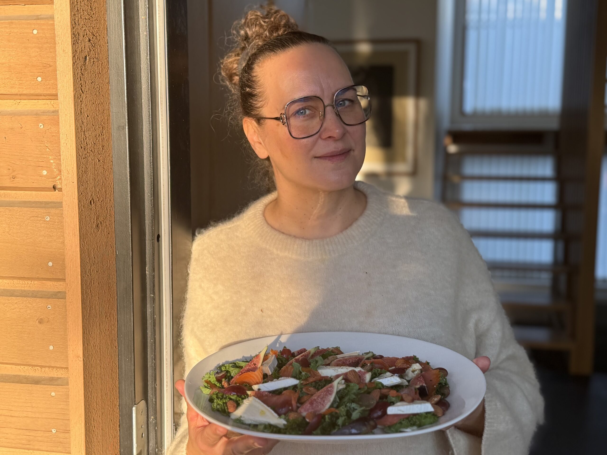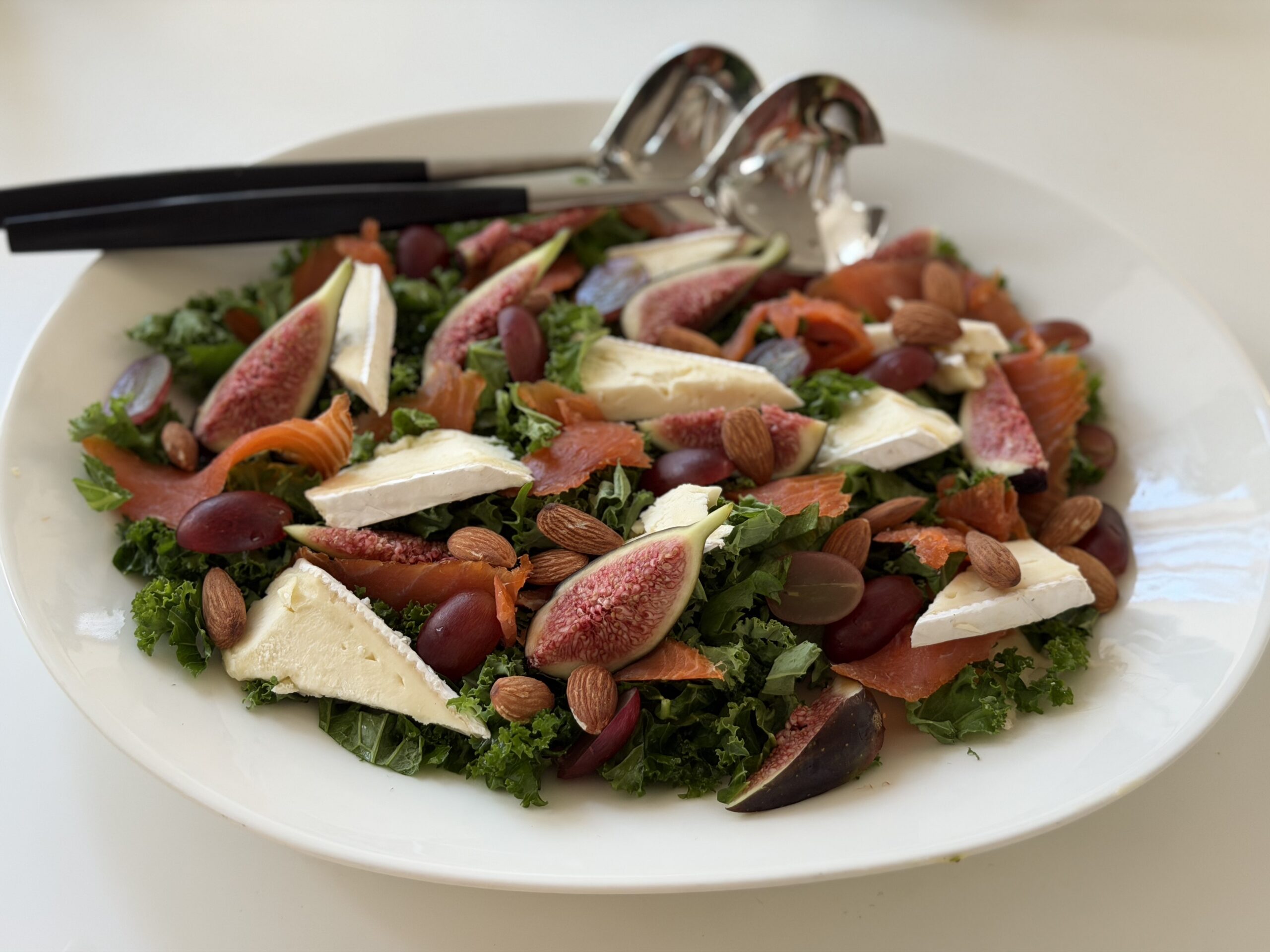 Salaatissa oli kivasti ruokaisuutta ja makua, Vieraat pitivät yllättävästi lehtikaalista, joka toimi salaattipohjana. Viikunat ovat nyt parhaimmillaan ja miten mehukkaita ja makeita ne olivatkaan. Rasvainen kylmäsavulohi ja valkohomejuusto saivat täydellisen makuparin viikunasta. Tätä salaattia voisi tehdä myös joulupöytään ja varioida raaka-aineiden mukaan.