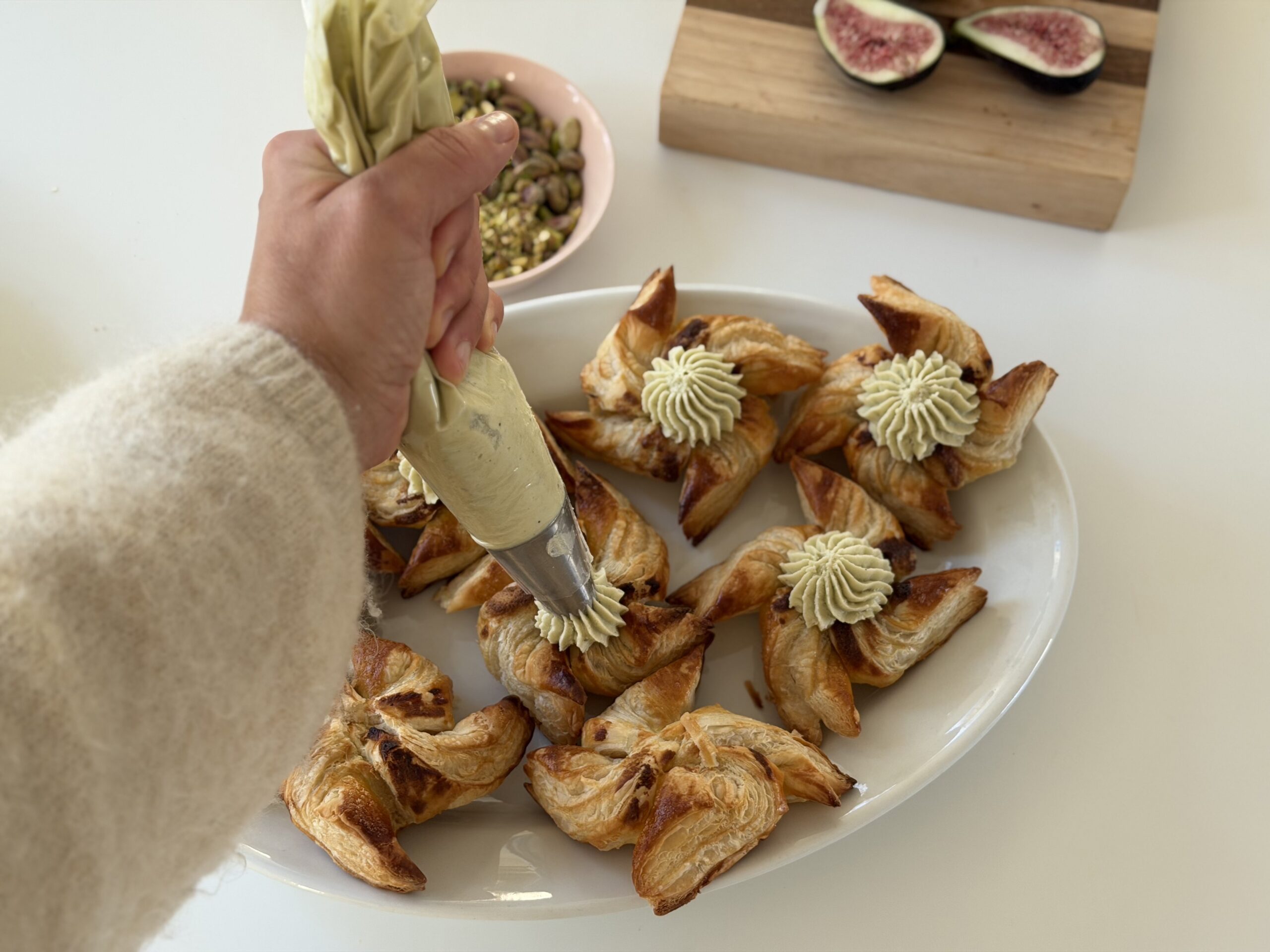 - Pursota täytettä torttujen päälle ja lusikoi rouhittuja pistaaseja täytteen päälle.