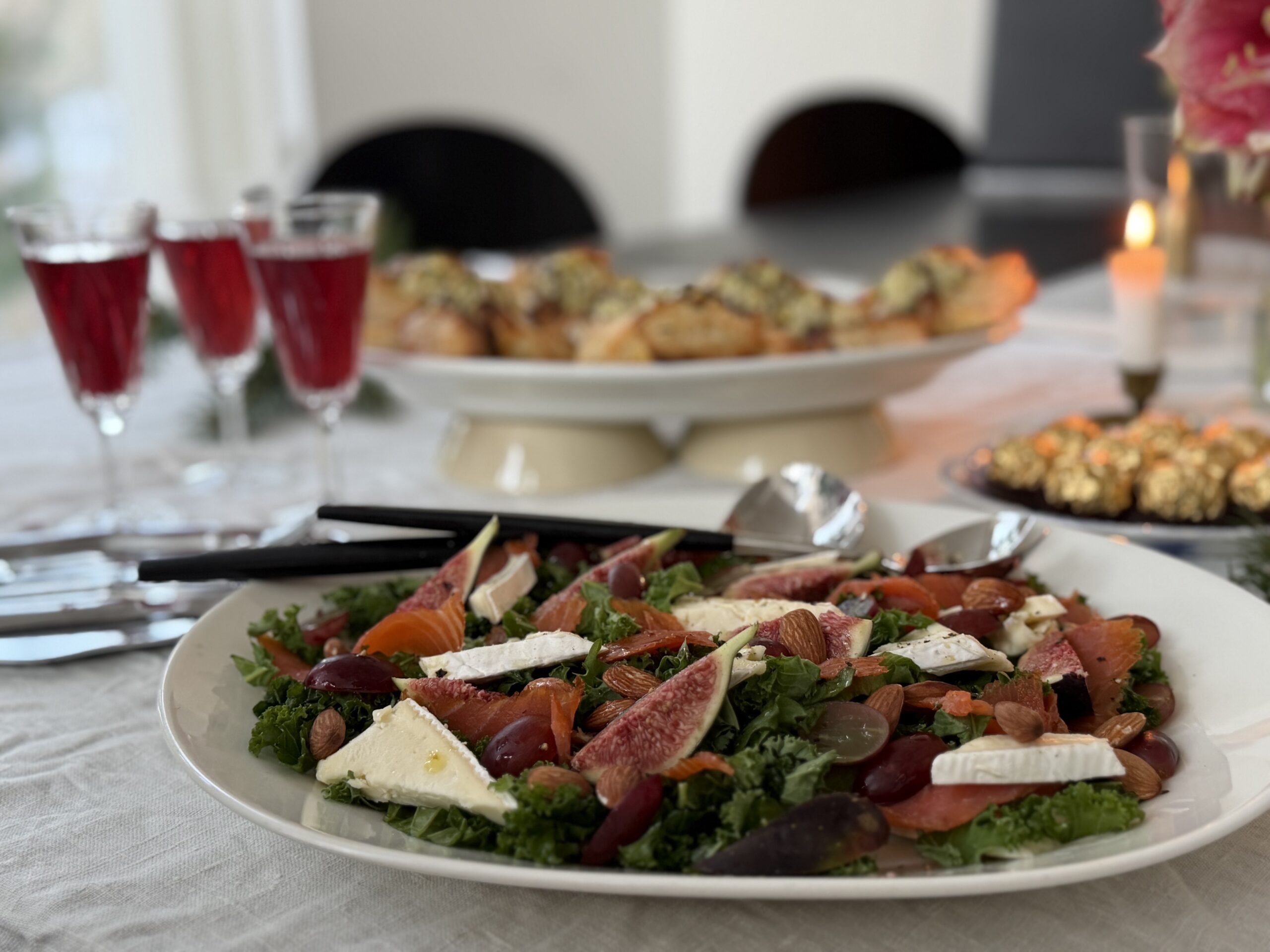 Salaatissa oli kivasti ruokaisuutta ja makua, Vieraat pitivät yllättävästi lehtikaalista, joka toimi salaattipohjana. Viikunat ovat nyt parhaimmillaan ja miten mehukkaita ja makeita ne olivatkaan. Rasvainen kylmäsavulohi ja valkohomejuusto saivat täydellisen makuparin viikunasta. Tätä salaattia voisi tehdä myös joulupöytään ja varioida raaka-aineiden mukaan.