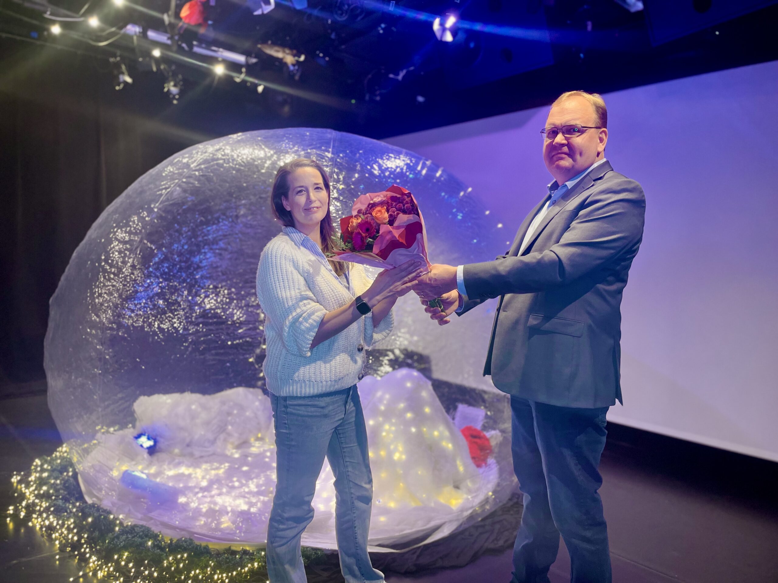 Eastonin kauppakeskuspäällikkö Olli Virtanen ojensi voittokukat Maria Baricille.