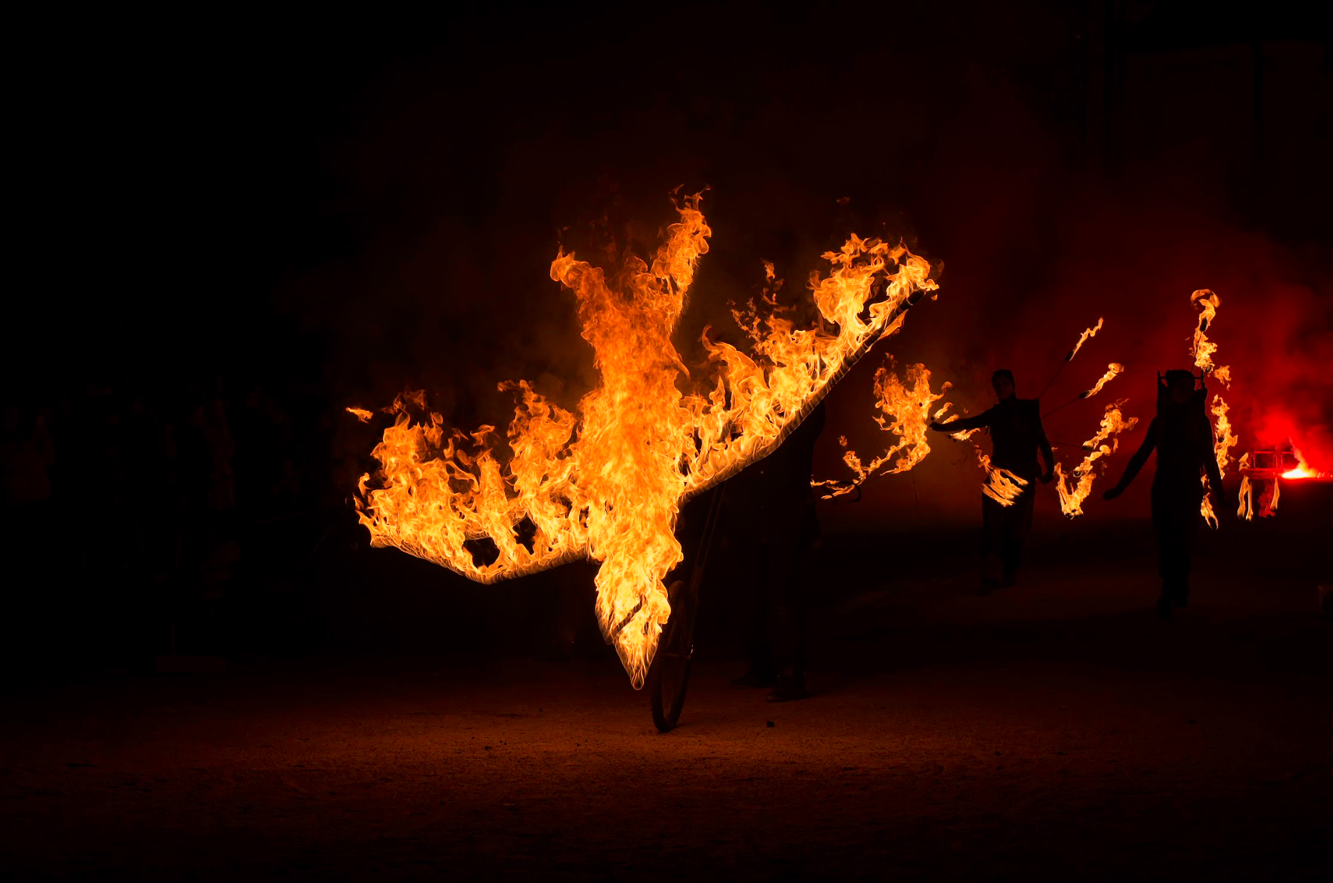 Näyttävissä, kaduilla ja aukioilla esitettävissä tuliteatteriesityksissä lavasteet, soittimet ja nuket leiskuvat tulta liekehtien katsojille valoa ja toivoa.
