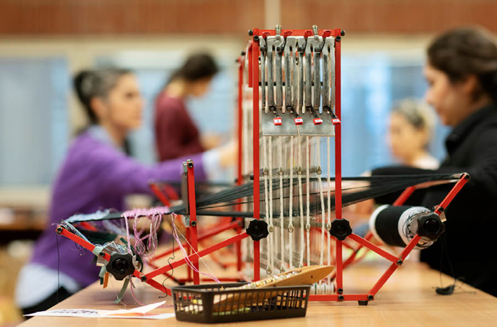 Kudontakioskiin voi tulla kokeilemaan kutomista matalalla kynnyksellä – työvälineet ja materiaalit löytyvät paikan päältä. Kangaspuut ovat vapaasti käytettävissä