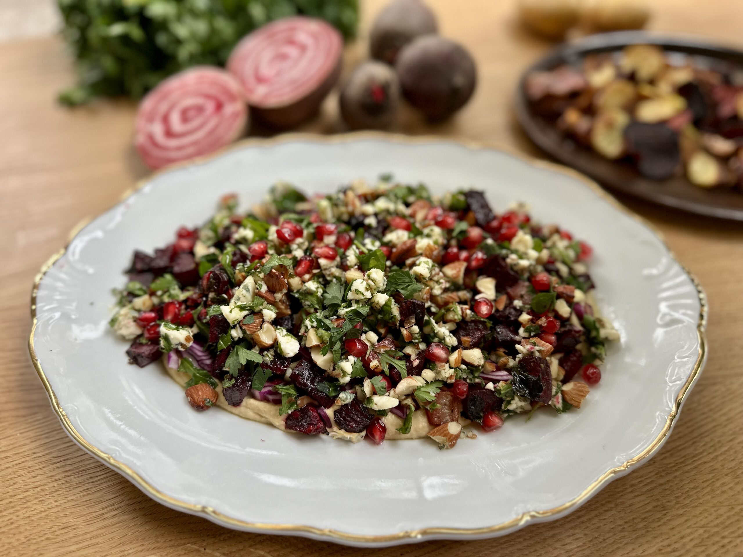 - Kokoa annos. Levitä tarjoiluastian pohjalle hummus tasaisesti. Lisää paahdetut juureslohkot ja lopuksi sinihomejuusto- pähkinä- rucolaseos. Koristele halutessasi granaattiomenan siemenillä.