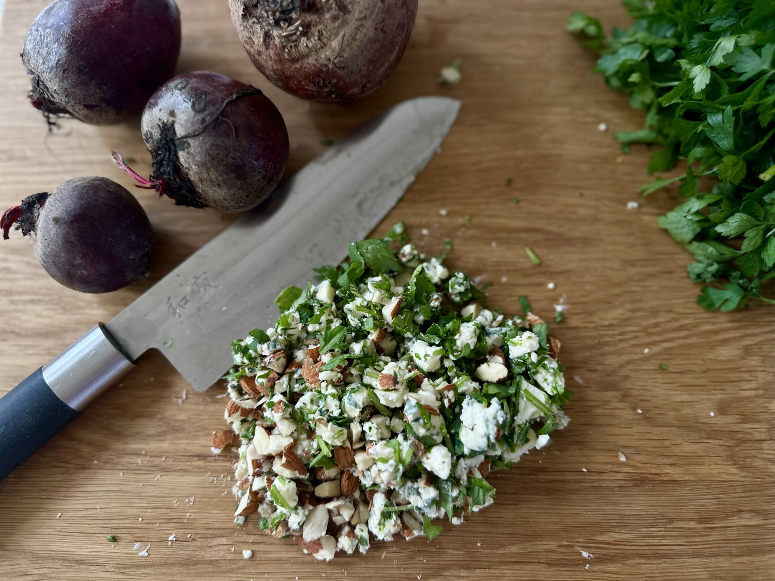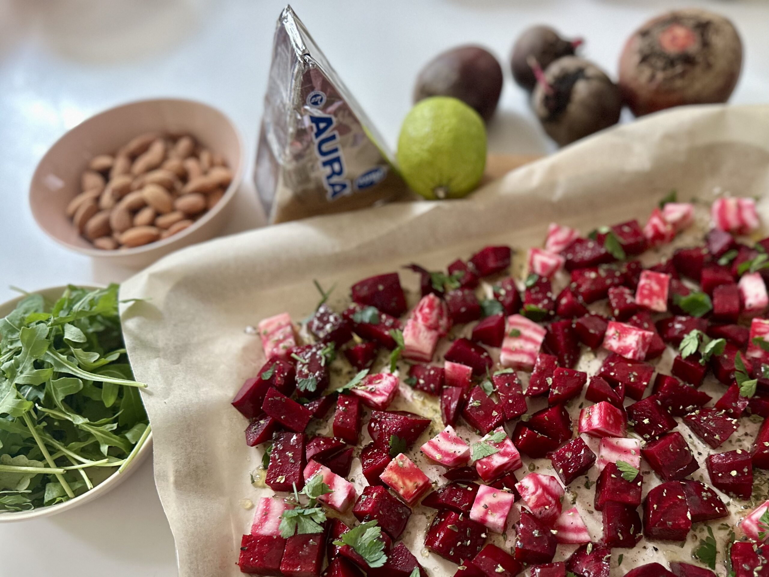 - Kuori puna- ja raitajuuret ja paloittele ne sopiviksi palasiksi. Levitä paloitellut juurekset leivinpaperilla peitetylle pellille ja pirskottele päälle oliiviöljyä. Lisää suola, pippuri, appelsiininkuoriraaste ja hunaja. Lisää silputtu lehtipersilja.