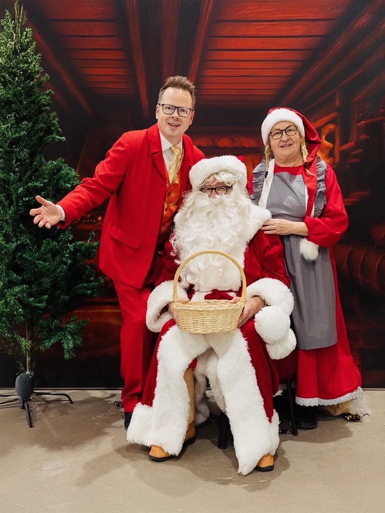 Juontaja Jari Repo pääsi kuvaan joulupukin ja joulumuorin kanssa.