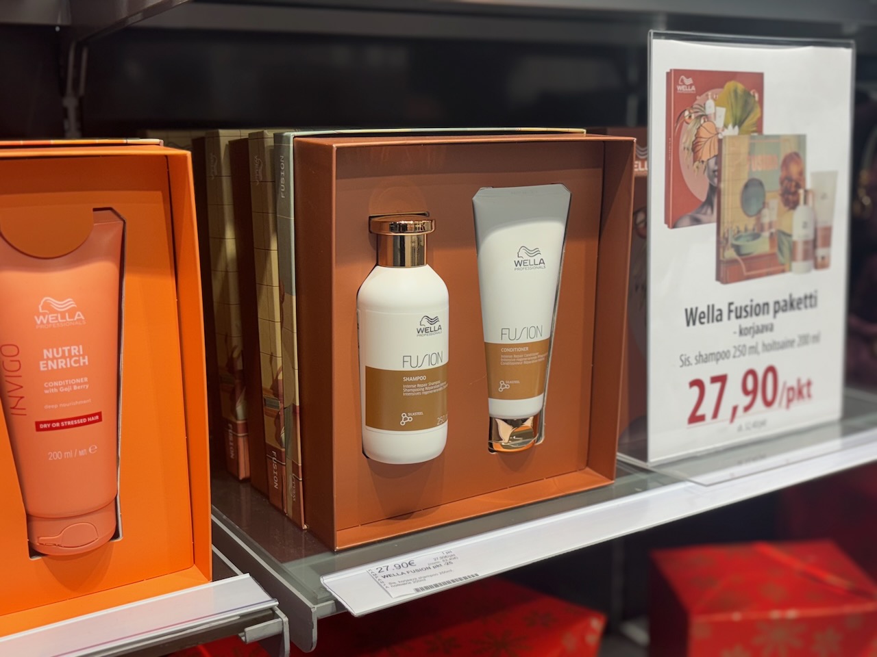 Hiustalon lahjapakkauksista löytyy vaihtoehtoja kymmenittäin eri hiustyypeille kuten värjätyille, kuiville ja kiharille hiuksille. Oma suosikkini on Wella Fusion -shampoo ja hoitoaine lahjapakkauksessa. Ylellinen tuoksu ja siloittava koostumus tekevät tästä lahjan, joka sopii monelle ja tuntuu arjessa erityiseltä. Myös L’Oréal Professionnel Metal Detox -sarjan puhdistavat tuotteet lahjapakkauksessa ovat varma valinta.