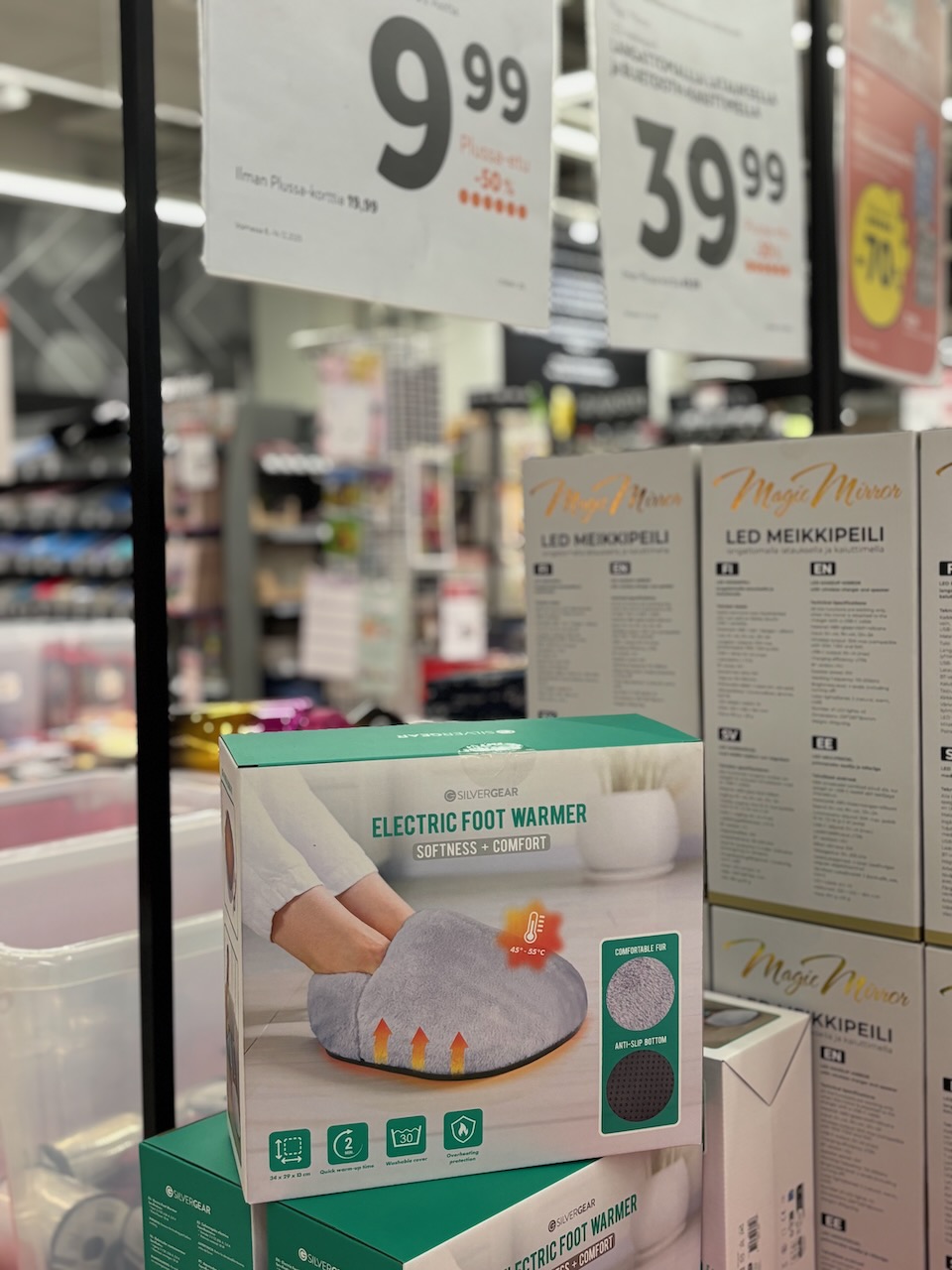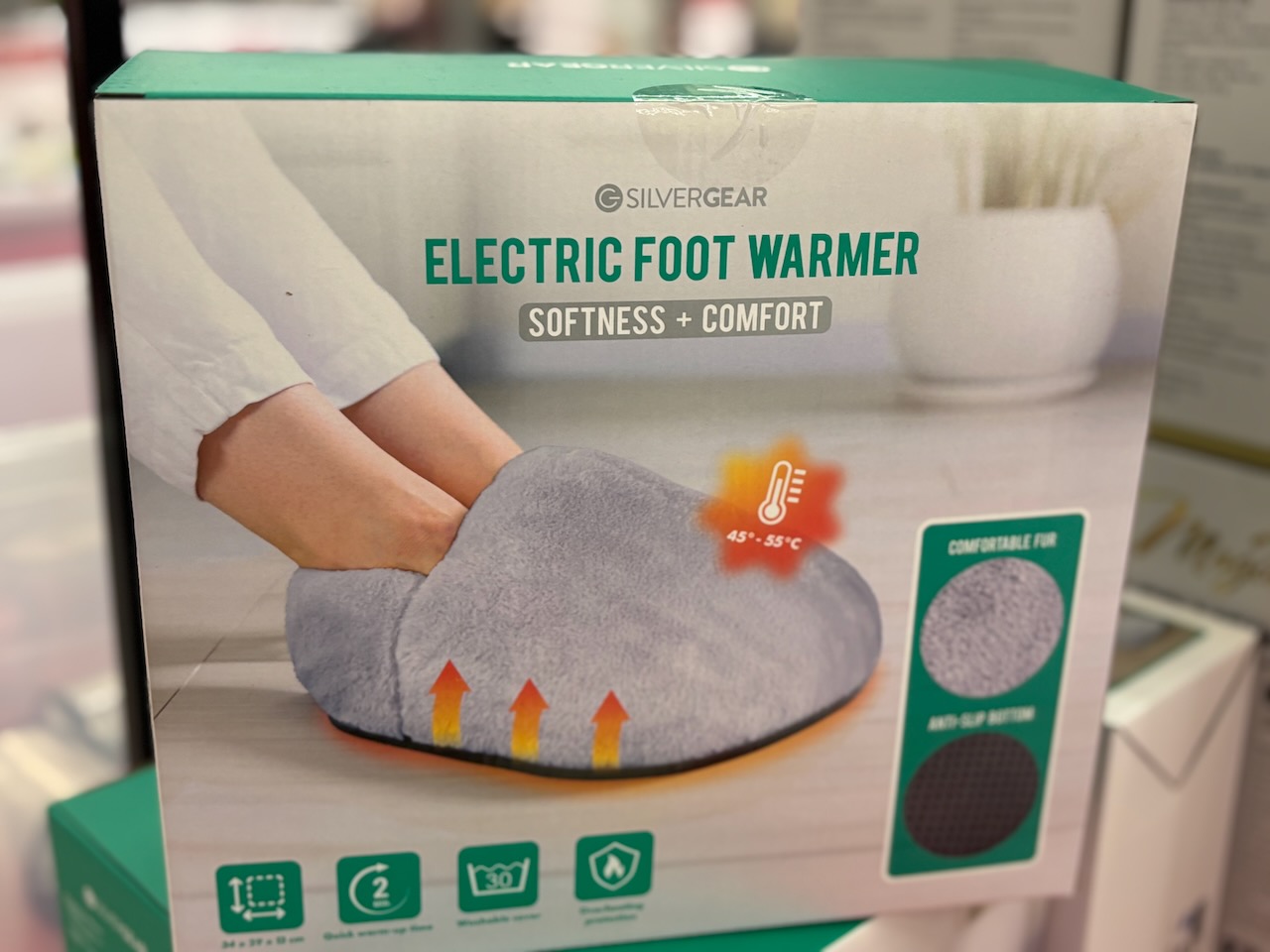 Silvergear jalkojen lämmitin on ihana hemmottelulahja. Pehmeä fleecekankainen, elektroninen tohveli lämmittää kylmät jalat ja kutsuu rentoutumaan joulunpyhinä.