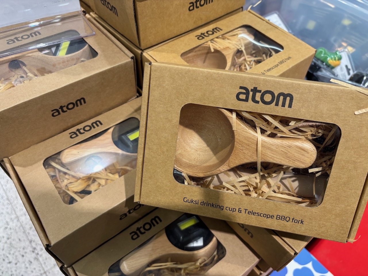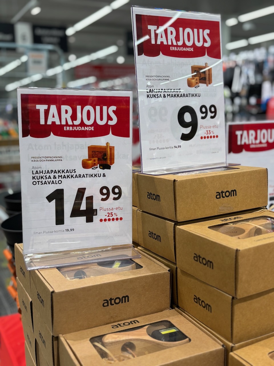 Retkeilijälle sopivat Atomin lahjapakkaukset, joissa voi olla esimerkiksi kuksa, makkaratikku ja otsavalo. Pieni kokonaisuus, joka kutsuu ulos luontoon.
