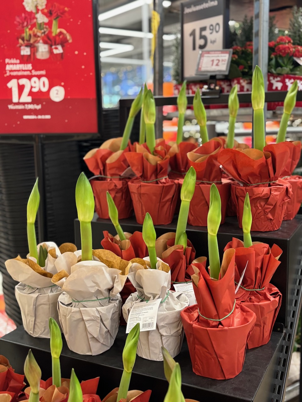 Jouluinen kukka-asetelma on aina varma valinta. Valmiit asetelmat hyasinteista, amarylliksistä ja kuusiasetelmista sopivat sekä kotiin että kyläilylahjaksi. Kukka tuo joulun tunnelman mukanaan. Tällaisen hankin itse anopille ja appiukolle!