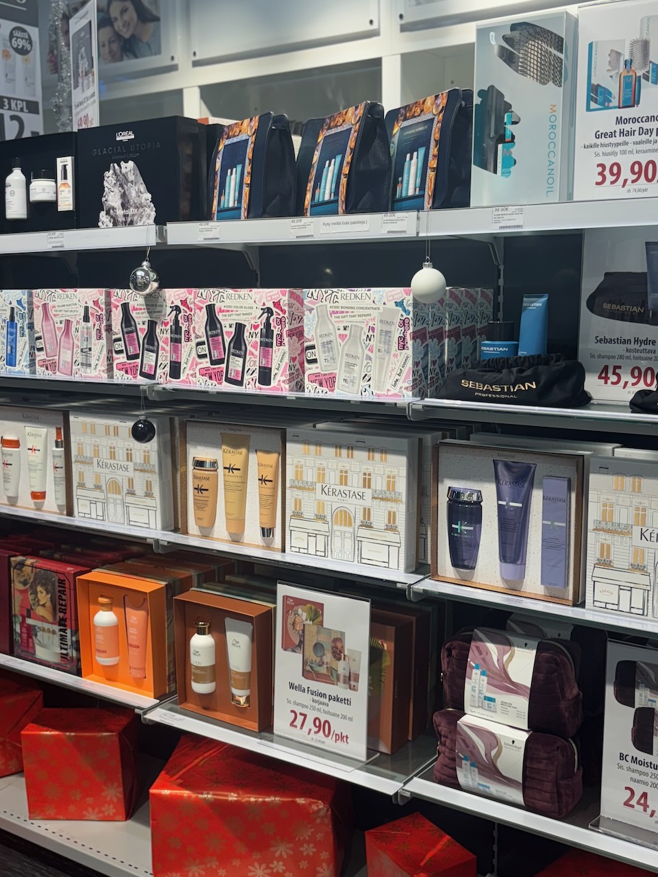 Hiustalon lahjapakkauksista löytyy vaihtoehtoja kymmenittäin eri hiustyypeille kuten värjätyille, kuiville ja kiharille hiuksille. Oma suosikkini on Wella Fusion -shampoo ja hoitoaine lahjapakkauksessa. Ylellinen tuoksu ja siloittava koostumus tekevät tästä lahjan, joka sopii monelle ja tuntuu arjessa erityiseltä. Myös L’Oréal Professionnel Metal Detox -sarjan puhdistavat tuotteet lahjapakkauksessa ovat varma valinta.